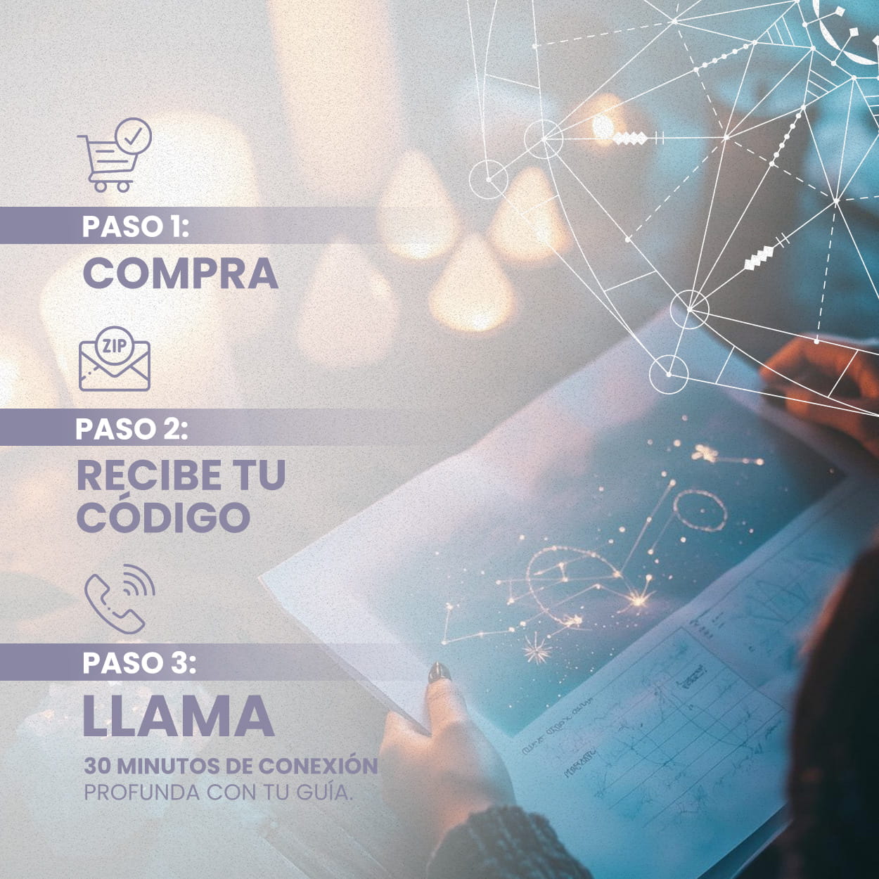 En media hora puedes explorar un área de tu vida en profundidad, o bien conectar varios temas que se entrelazan — amor, propósito, decisiones, familia, salud o dinero — para encontrar la coherencia que tu alma busca.